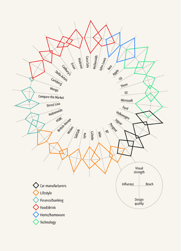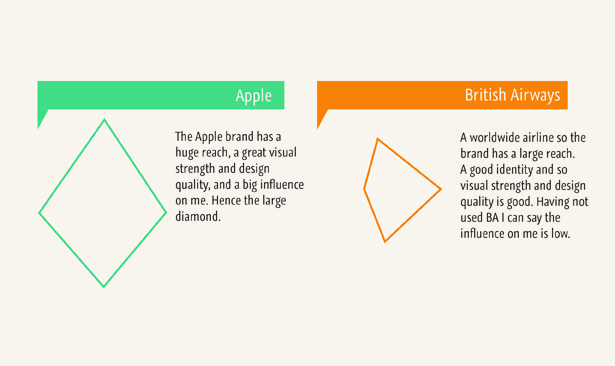 The infographic visualises and compares my impression and opinion on some popular and well-marketed brands. I broke this down into four main criteria. The visual strength, the reach, the influence (on myself) and the design quality. These things don’t need quantifiable results. The infographic works on illustrating how well each brand ‘scores’ under each category, shown where the point of the diamond meets each axis.